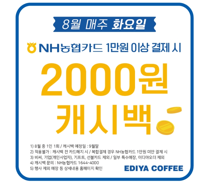 NH농협카드 굉장히 대중화가 많이 되어 있고 젊은 대학생 친구들이라면 누구나 한번쯤은 사용해 봤을 법한 그리고 현재까지도 많이 사랑받는 NH농협카드 인데요. 스타벅스가 있다면 꼭 주변에 하나씩은 있다는 이디야커피 만원이상 결제하고 2,000원 캐쉬백 받을 수 있는 이벤트를 꼭 참여해 보시면 좋을 것 같습니다.