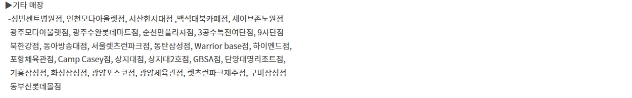 ▲ 기타매장 내역으로 성빈센트병원점, 인천모다아울렛점, 서산한서대점, 백석대북카페점, 세이브존노원점,광주모다아울렛점, 광주수완롯데마트점, 순천만플라자점, 3공수특전여단점, 9사단점, 북한강점, 동아방송대점, 서울렛츠런파크점, 동탄삼성점, Warrior Base점, 하이엔드점, 포항체육관점, camp casey점, 상지대점, 상지대2호점, GBSA점, 단양대명리조트점, 기흥삼성점, 화성삼성점, 광양포스코점, 광양체육관점, 렛츠런파크제주점, 구미삼성점, 동부산롯데몰점