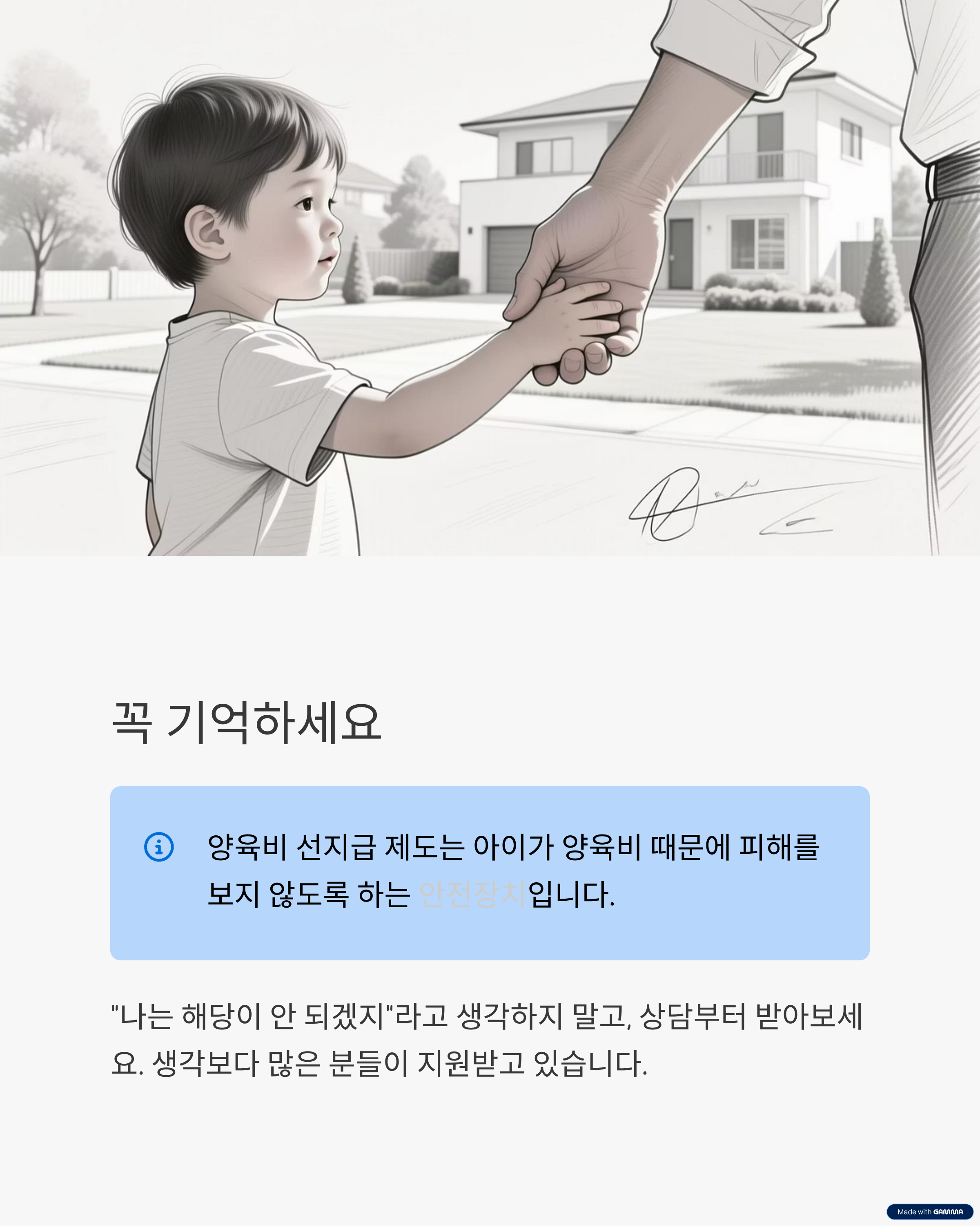 양육비 선지급 제도는 아이가 양육비 때문에 피해를 보지 않도록 하는 안전장치입니다. 혹시라도 “나는 해당이 안 되겠지”라고 생각하지 말고, 상담부터 받아보시는 것이 좋습니다. 생각보다 많은 분들이 지원을 받고 있고, 국가가 강력하게 회수 절차를 진행하기 때문에 혼자 고민하는 것보다 훨씬 든든한 제도입니다.