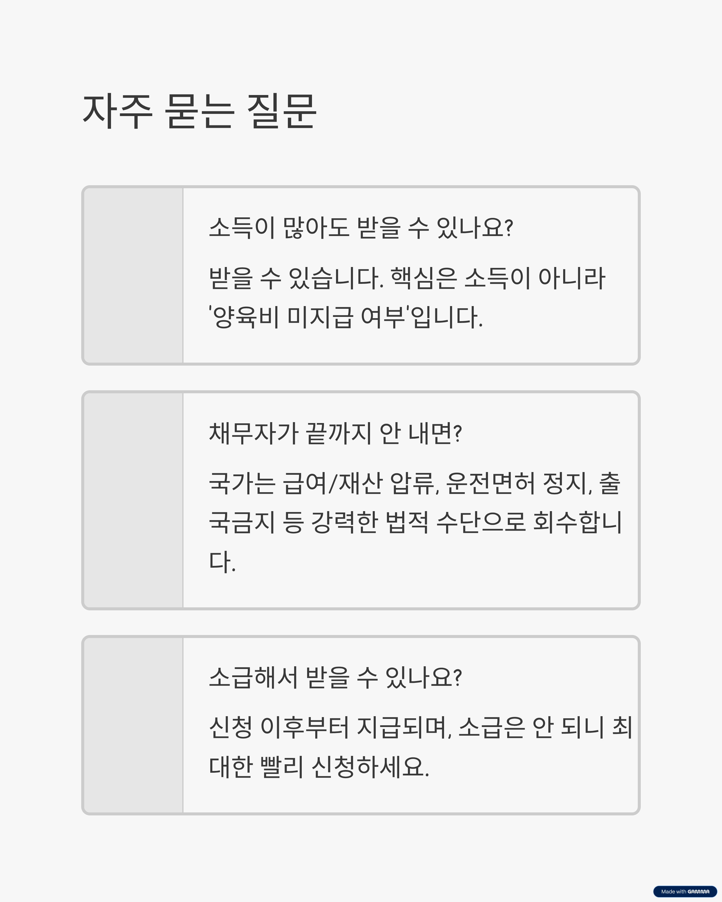A. 받을 수 있습니다. 이 제도의 핵심은 소득이 아니라 ‘양육비 미지급 여부’입니다.