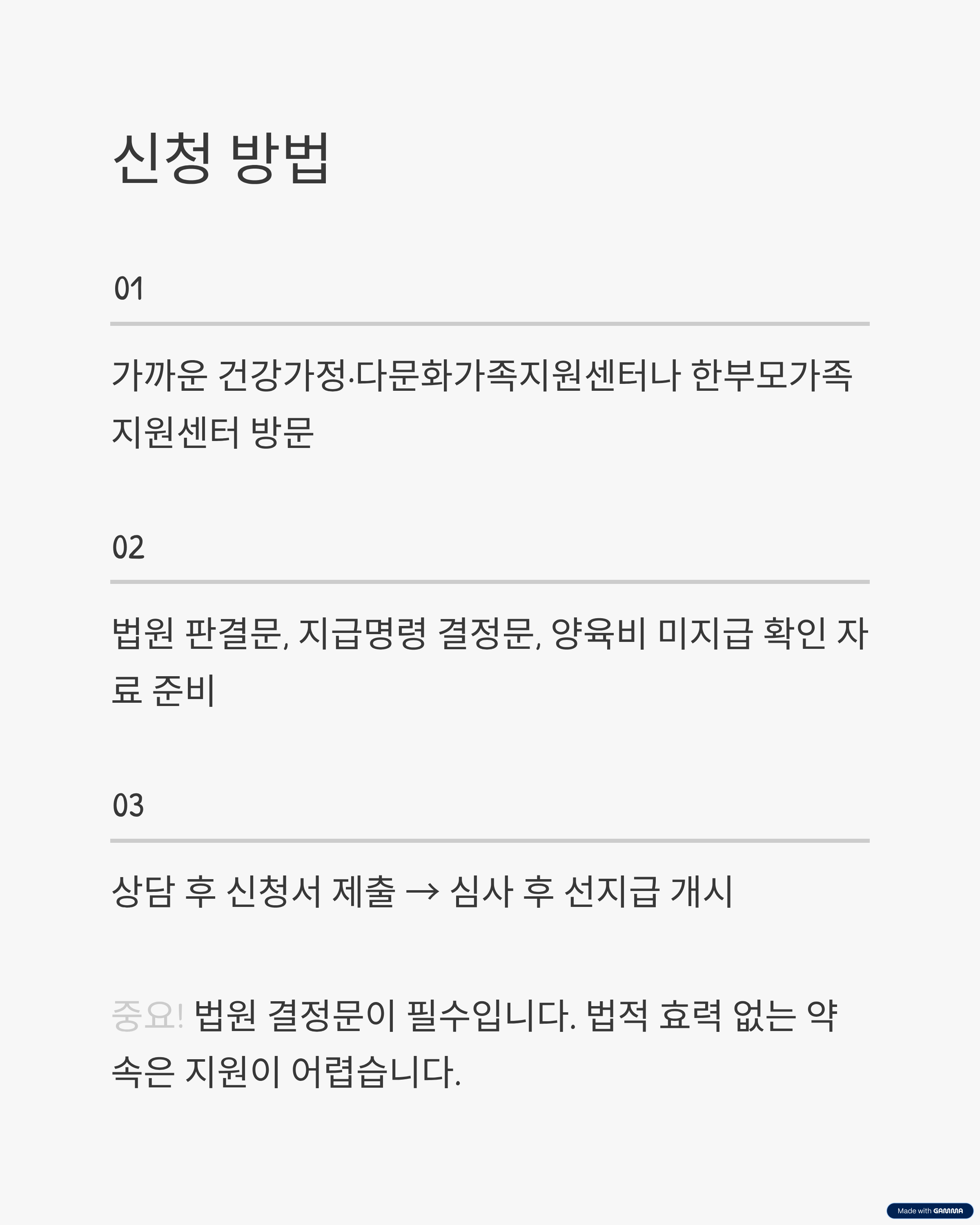 신청 과정에서 가장 중요한 것은 "법원 결정문"입니다. 단순히 약속만 하고 법적 효력이 없는 경우에는 지원이 어렵습니다.